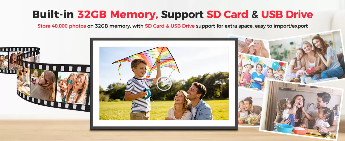 You can play photos and videos directly from an external storage (e.g. a micro SD card) without the need to take up space on the frame’s internal storage.