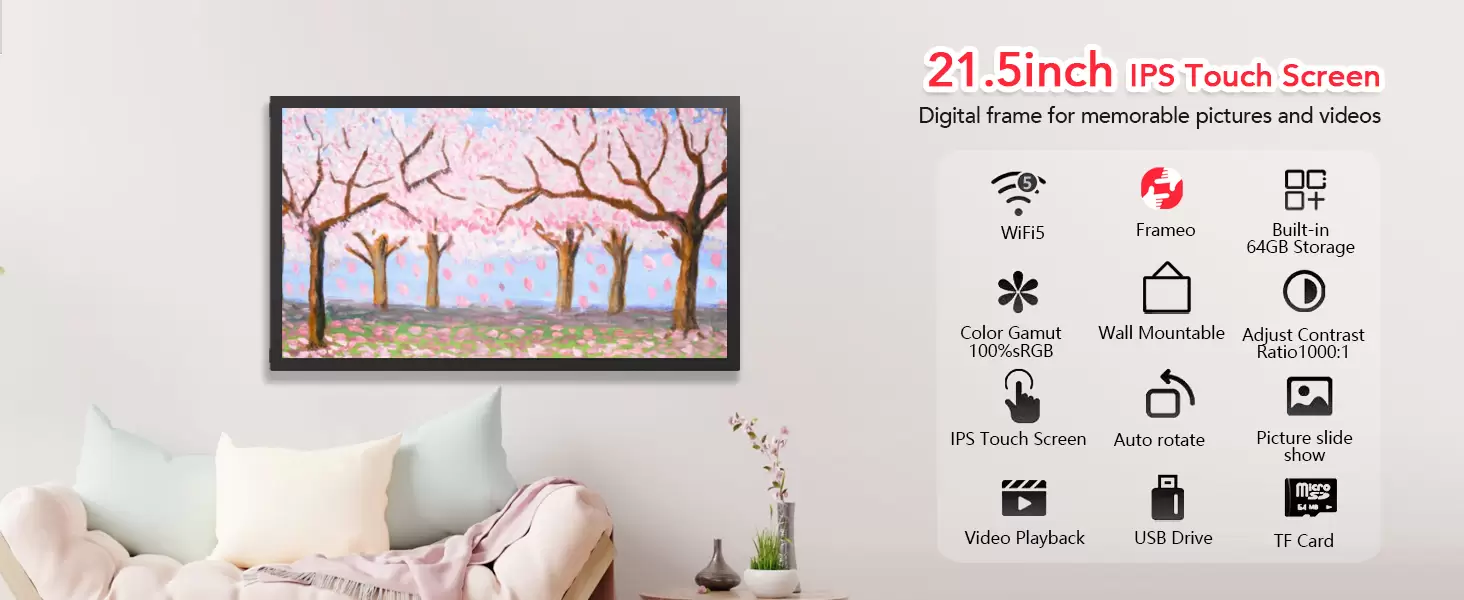 Frameo 21.5 Inch 64GB Digital Picture Frame, IPS HD Touch Screen, Photo Frame with Auto-Rotate Instant Share Photo/Video Sharing via Frameo App, Gift for Mom